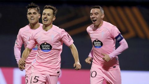 Los futbolistas del Celta celebran uno de los tres goles anotados ante el Dinamo de Zagreb.