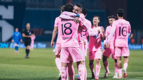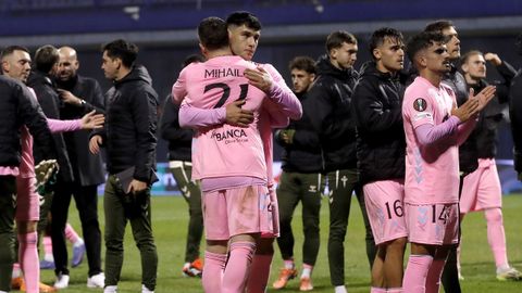 Los futbolistas del Celta aplauden a los aficionados desplazados a Zagreb tras el triunfo ante el Dinamo.