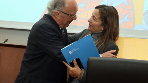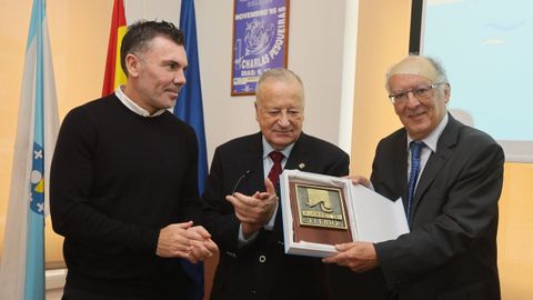 González Laxe, en Celeiro, cuyo sector pesquero le distinguió con la insignia de oro en un homenaje en el que Antonio Nores (a su izquierda) glosó su vida y obra