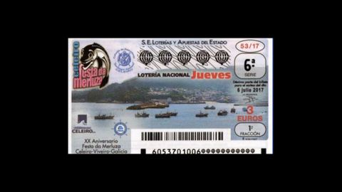 23 jun 2017 . Actualizado a las 05:00 h.La Festa da Merluza de Celeiro, con motivo de su vigésimo aniversario, protagonizará el décimo de la lotería nacional del sorteo del 6 de julio. El décimo se presenta hoy, a las 20.00 horas, en el muelle sur del puerto. Desde la Delegación Comercial de Loterías y Apuestas del Estado destacan que en ese sorteo se distribuirán diez millones de décimos, lo que sin duda contribuirá a la promoción de la Festa da Merluza de Celeiro.