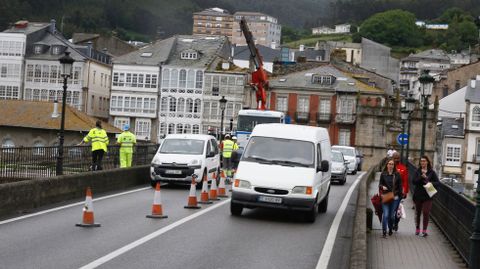 La Policía Local regula el tráfico en las horas punta, lo que contribuye a agilizar la circulación y reduce los trastornos, inevitables por las obras para arreglar tajamares del puente de A Misericordia. El corte de un carril de ese viaducto también afecta a los peatones, que solo pueden caminar por la acera izquierda, en dirección a Covas.