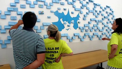 En efecto, no IES desenvolveron este curso unha fermosa actividade que consistiu en recoller as palabras propias da localidade. Con elas, alumnos e profesores compuxeron un Mar de Linguas. Sobre as paredes dun dos corredores do centro foron colocando, unha a unha, formando un mar e arredor dunha silueta da Illa, unhas tarxetiñas azuis. Cada unha delas agochaba un tesouro: una palabra ou un dito particular da Arousa que, cando levantaba a súa solapa, deixaba ver o seu significado.