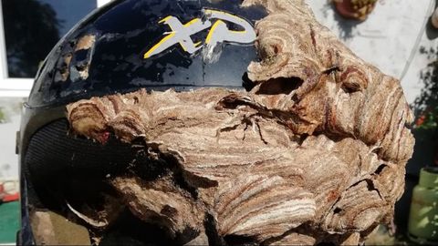 17 ago 2019 . Actualizado a las 14:49 h.Protección Civil de Ribadumia lleva años retirando nidos de avispa velutina; en árboles, en viñas, en tejados, en balcones, en muros..., pero nunca habrían imaginado que un día les iban a avisar para que recogieran un nido en un lugar tan insólito. El miércoles un vecino de Padrenda los llamó para pedirles que se hicieran cargo de un nido de avispa velutina localizado en el interior de un casco de moto. Se ve que los insectos encontraron acomodo entre sus mullidas paredes y el nido fue creciendo hasta el punto de desbordar el elemento protector.