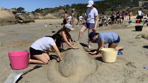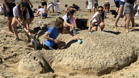 O sol quentaba este venres na coñecida praia da península, pero iso non diminuíu a ilusión dos estudantes, que maqueta en man se dispoñían a dar forma e volume aos seus proxectos, unha tarefa nada doada baixo as altas temperaturas. Cargados con capachos cheos de area mollada camiñaban en grupo cara ás súas parcelas para esculpir cadansúa idea, aconsellados polos docentes. Uns escavaban para facer oco e crear a peza, outros amoreaban o material sobre a area para darlle altura, e había quen lograba artellar por partes aos réptiles saíndo da area.