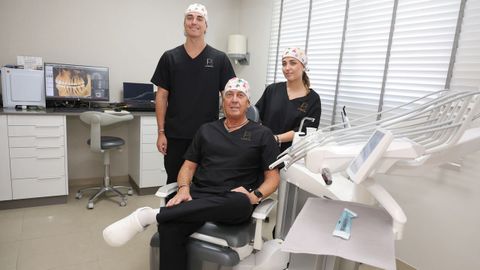 Carlos llegó en los noventa a Galicia desde Argentina. En su clínica dental, que acaba de cumplir 25 años, trabajan ahora sus hijos Pedro y Sofía, en quienes confía legar pronto el mando para jubilarse.