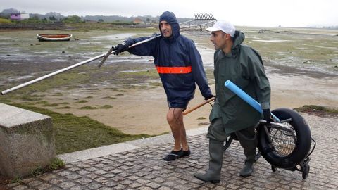 Él y Fariña, el otro recién llegado, se han decidido por utilizar el raño en sus dos primeros días de faena en el banco de O Sarrido. «Pescas más, aunque tiene que haber agua para poder usarlo», dicen. Y no debe ser mala fórmula la de utilizar el raño, porque ambos mariscadores fueron de los primeros en completar la recogida y en entrar a pesar y contabilizar el marisco.