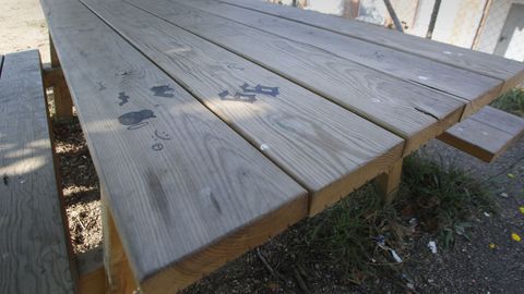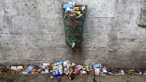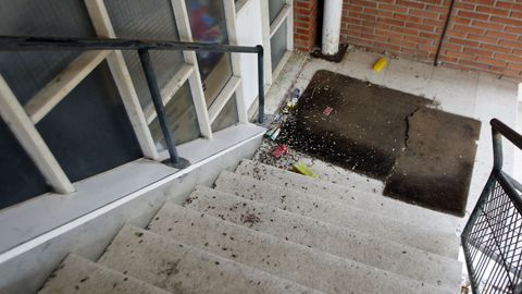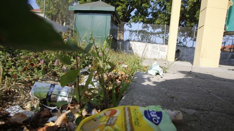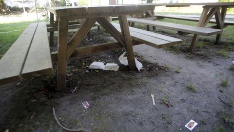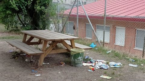 «Aquí temos un problema e é que entran pandillas a facer botellón sempre», explica Manuel Felpeto, director del colegio público en cuestión. Esta práctica hace que el recinto se encuentre en deterioro, ya que no hay rincón del patio en el que no asome la basura o en el que no haya desperdicios en el mobiliario. Persianas dañadas, puertas de cristal rotas, muros y mesas pintadas, carteles y columpios destrozados, son algunas de las heridas que se pueden ver a simple vista. «O que máis rabia me dá é que deixamos a porta aberta para que a xente desfrute deste espazo e nos atopemos con isto», explica el director, el mismo que habló con una de las pandillas ya habituales que celebran en el lugar sus citas con el alcohol y se ocupó de que se colocasen papeleras y contenedores al lado de las mesas para que depositen la basura en ellos. «Pero nin con esas», añade.
