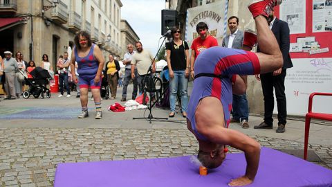 22 jul 2017 . Actualizado a las 05:00 h.Entre el 10 y el 15 de agosto • Vilagarcía • La esquina entre las calles Rey Daviña y Valentín Viqueira acogió ayer una muestra de lo que se verá en Vilagarcía entre el 10 y el 15 de agosto. Fran Rei y Pedro Brandariz, de la compañía Os sete magníficos máis un, presentaron algunos de los gags de clown clásico, que terminaron con la invitación al alcalde, Alberto Varela, de mojarse por el Festiclown. Siendo, finalmente, Fran Rei quien realizó una acrobacia para «sumergirse» en un vaso de agua ante los numerosos viandantes que se quedaron a ver el espectáculo.
