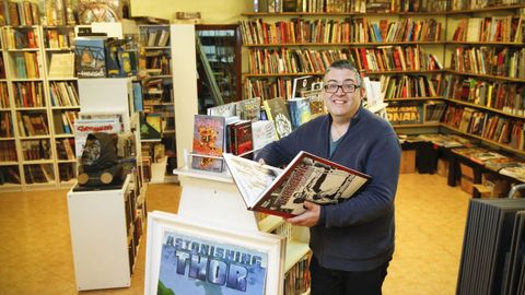 En 18 anos no negocio, o vilaxoanés converteu a súa tenda nun referente da banda deseñada, cunhas 20.000 obras á venda