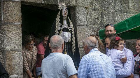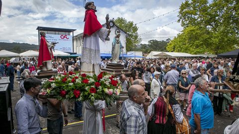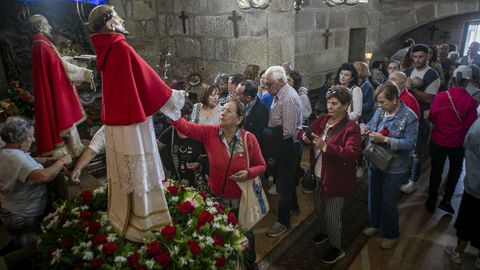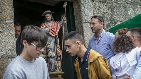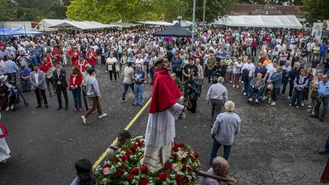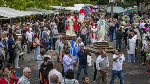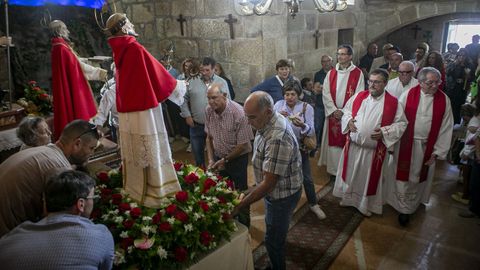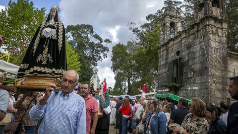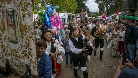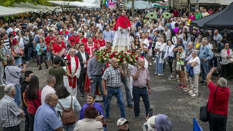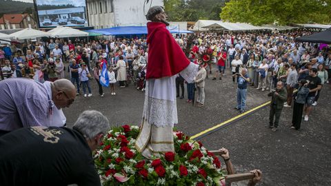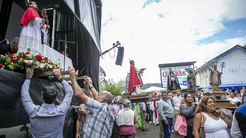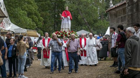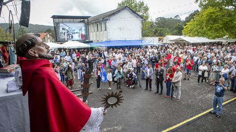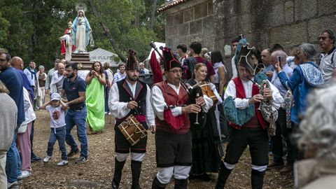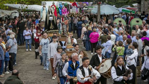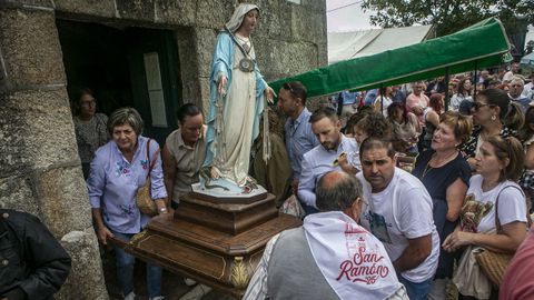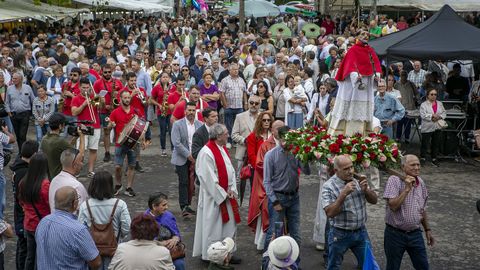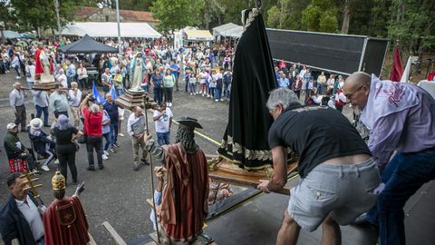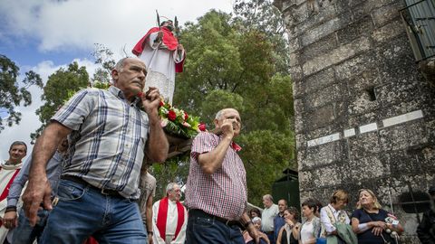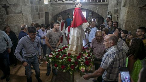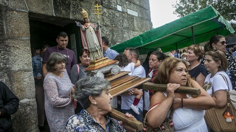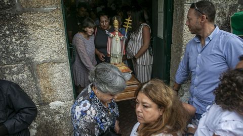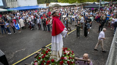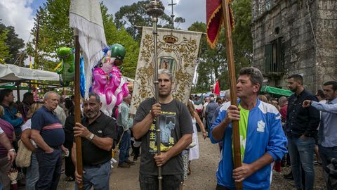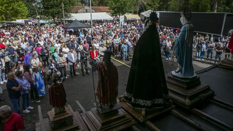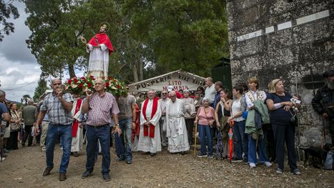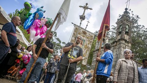 La procesión, en la que hombres y mujeres portaron varias imágenes, partió de la ermita al son de los instrumentos de la charanga Mil9 y de un fuerte repique de campanas. Antes de salir, el sacerdote advertía por megafonía que «teñades coidado coas carteiras», ya que un evento tan concurrido es todo un caramelo para los amigos de lo ajeno.