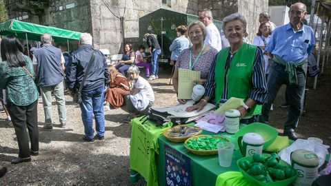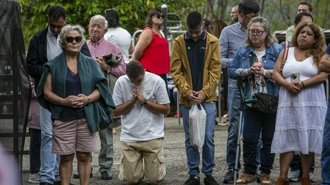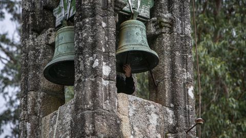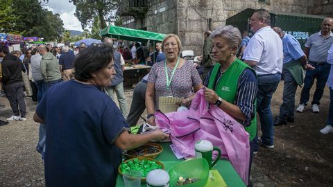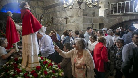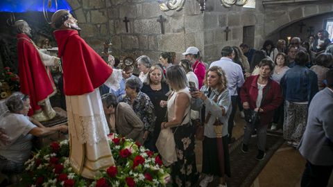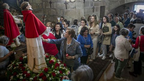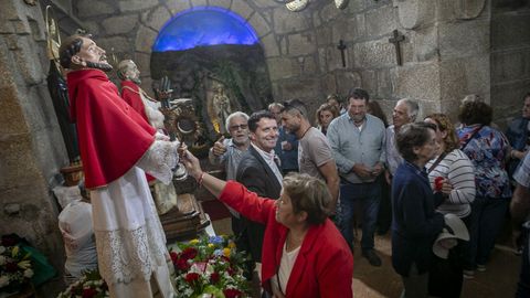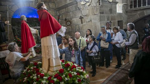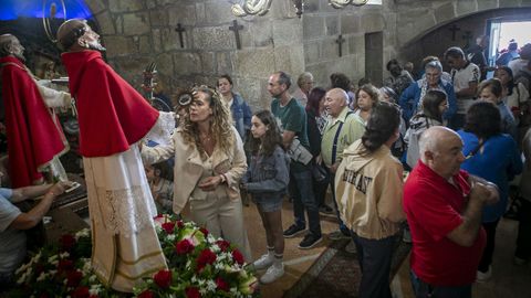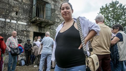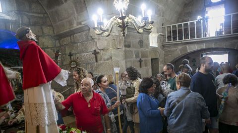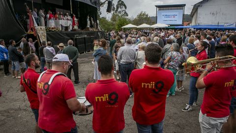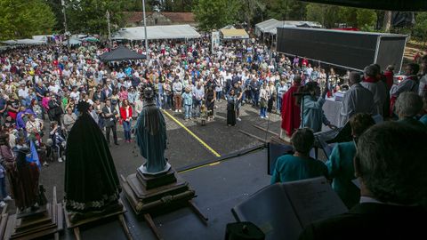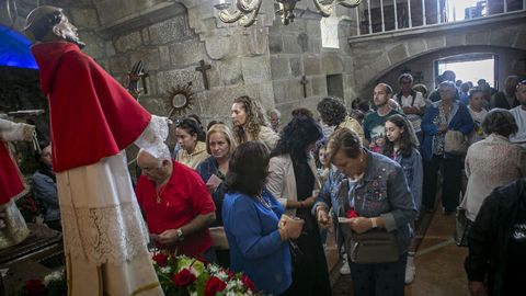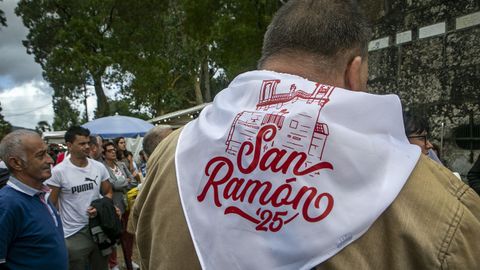 La capilla registró un trasiego constante de fieles durante toda la mañana, con colas para acercarse al santo y realizar ofrendas. Una de ellas fue María Calvo, una vecina de Teo que, acompañada de su suegra, se estrenó en la romería para pedir a San Ramón «que me axude a ter un parto rápido». Embarazada de 34 semanas de una niña, asistió a la misa que precedió a la central, la de la una del mediodía, que se oficia al aire libre desde el palco de la orquesta.