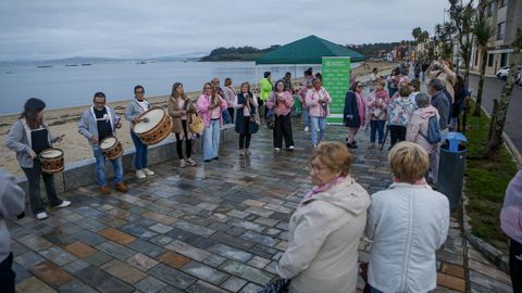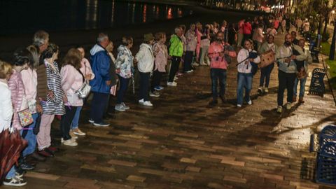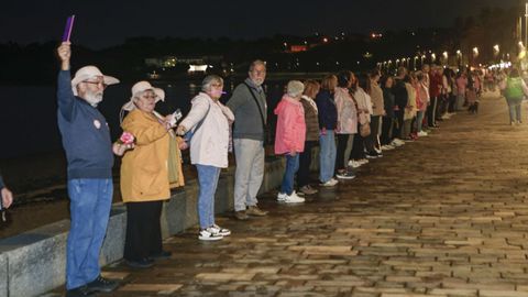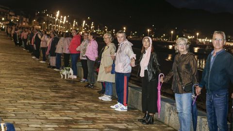 Decenas de personas se dieron cita en el paseo de Os Areos. La mayoría portaban prendas de vestir rosas, pero este color cobró un brillo y una relevancia especiales a través de decenas de luces que la entidad organizadora repartió entre los presentes. El momento culminante llegó cuando todos los asistentes entrelazaron sus manos formando una extensa cadena humana.