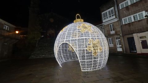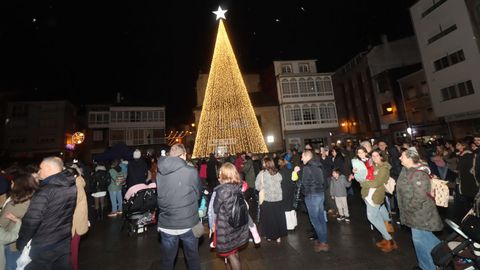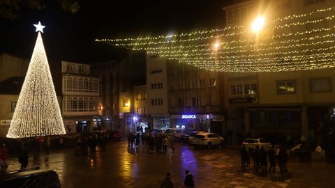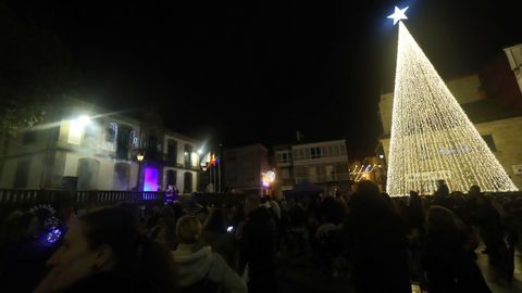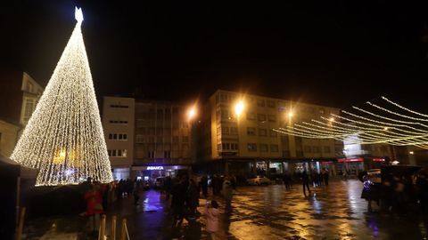 Tras la alocución desde el balcón consistorial y la proyección de imágenes en la fachada, se procedió sin más dilación al encendido del alumbrado, que comenzó por la tira de luces de la alameda y continuó por la ornamentación lumínica de la plaza Rafael Dieste y por el árbol.