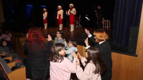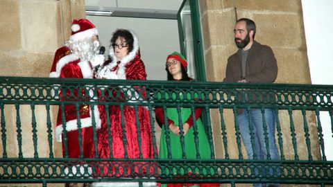 Ambos se subieron al balcón de la casa consistorial para dirigirse a los rianxeiros que estaban esperando en una plaza totalmente a oscuras para poder observar con nitidez la posterior proyección de un montaje con imágenes navideñas acompañadas de música en la fachada del Concello. Desde allí, Papá Noel se atrevió a entonar una copla que, según aseguró, solo había escuchado en Rianxo. Una ayudante muy servicial lo acompañó cantando.