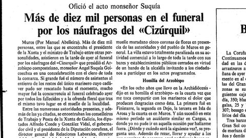 Tal día como hoy, mientras continuaban las tareas de búsqueda de los cuerpos de los otros siete marineros, que se encontraban en el interior del barco en el momento del naufragio, se celebraba una misa en Muros, a la que asistían el entonces presidente de la Xunta, Gerardo Fernández Albor, y el ministro de Trabajo, Santiago Fernández Miranda, entre otras muchas autoridades y vecinos llegados de diferentes puntos de la comarca. Los actos en memoria de los marineros fallecidos culminaban con una ofrenda floral en el muelle de la localidad.