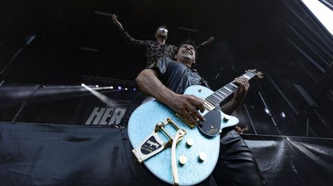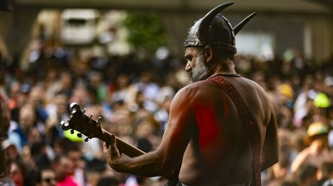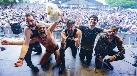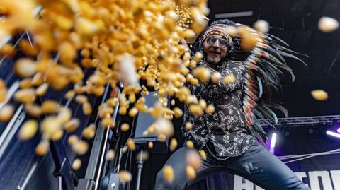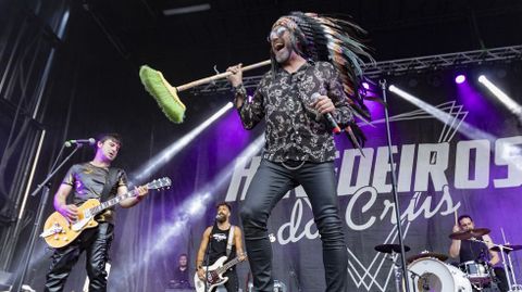 En todo momento hubo una gran conexión entre el grupo y los espectadores y Heredeiros da Crus echó mano de todo su repertorio de complementos. Tiraron de sulfatadora para duchar con agua al público y rebajar la temperatura ambiente. Con Que jallo é! tiraron maíz a los presentes y de algún punto llegaron al escenario dos escobas y una fregona con las que los miembros del grupo también jugaron.