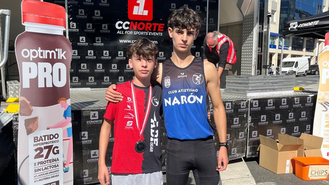 En Lugo, ayer, Anxo cruzó la meta de tercero entre los atletas élite, mientras que Iago fue segundo en sub-14. Presente y futuro del atletismo gallego.