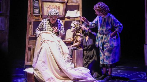 Me encantó la puesta en escena. De repente, de la parte frontal de esa casa, llena de cariño, afecto y autoridad (¡no son incompatibles!), aparece la cama de un hospital, donde fallece la madre, y más tarde, la de la habitación de la abuela, donde muere esta. De uno de los huecos, que simulan un rompecabezas, extraen una caja en la que, simbólicamente, guardan (o entierran) la ropa y la máscara de la madre de Jordi.