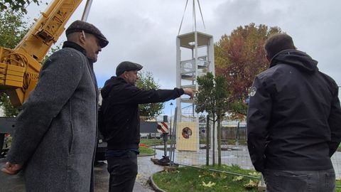 El alcalde, Daniel Pérez, y los ediles Juan Seoane y Miguel Vales se acercaron hasta el parque coincidiendo con la colocación de la torre, una operación que llamó también la atención de los vecinos porque fue precisa una grúa de grandes dimensiones.