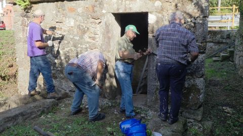 La pasada semana, los mayores empezaron a repicar y limpiar la antigua construcción en Redonda. «Repicalo por fóra para logo encintalo, poñerlle o teito con tella do país como deberan de estar todos, meterlle a porta...», explica Luís, uno de los participantes. Este viernes, siempre y cuando el tiempo lo permita, está previsto que sean los propios escolares los que continúen con los trabajos. Así, los pequeños aprenderán «como se facían as cousas antes».
