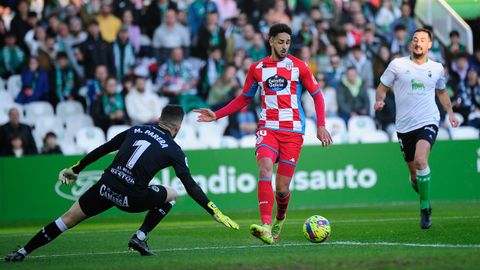 La primera situación de gol clara del encuentro no tardaría en llegar. La provocaron los locales y la disfrutaron los albivermellos. Pol Moreno se recreó en exceso en el control de la pelota en el vértice de su propia área y Chris Ramos se la arrebató, avanzó unos metros y se la cedió en el segundo palo a Sebas Moyano, quien no dio precisión a su remate llegando desde atrás. Como en el debut de Fran Justo ante el Levante, el Lugo era capaz de proteger su portería con solvencia y brindar una tarde plácida a Óscar Whalley. Pero además, a diferencia del anterior encuentro, conseguía discutir la posesión y el dominio a un Racing que solo daba sensación de peligro cuando Pombo tenía el esférico y levantaba el periscopio. Antes de esa ocasión de Moyano, Pablo Clavería había avisado culminando con la zurda y con recorte incluido una buena transición impulsada por el propio Sebas Moyano. Los minutos pasaban sin que ninguno de los protagonistas fuera capaz de poner la situación bajo control. Nadie daba un paso al frente ni arriesgaba más de la cuenta. Confiaban su suerte a los errores ajenos, que se repetían pero raras veces en el último tercio del campo. Pombo puso a prueba a Whalley en un par de acciones y Moyano y El Hacen se encontraron con una muralla de hombres en sendos remates dentro del área.