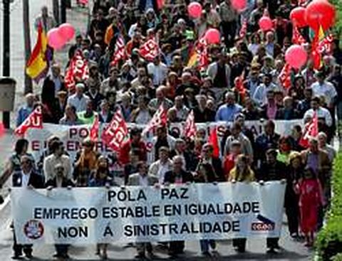 01 may 2006 . Actualizado a las 07:00 h.«Aquí siempre coincidimos los mismos», admite un cincuentón tras hacer una panorámica de la plaza de A Palloza. La protesta conjunta de CC.?OO. y UGT, un desfile de 1.200 personas hasta la Delegación del Gobierno, está a punto de partir. A 550 metros de la difunta Fábrica de Tabacos, en la plaza de Vigo, la CIG monta otra manifestación en solitario, respaldada por unas 500 personas. Paz, estabilidad, igualdad y siniestralidad son los cuatro ejes del acto de CC.?OO. y UGT. Los detalla el secretario comarcal del primer sindicato, José Manuel Lado. Paz por la tregua de ETA, «que valoramos con cautela». Estabilidad porque «duplicamos a media de precariedade da UE». Igualdad «entre homes e mulleres». Y reducción de la siniestralidad porque las cifras son altas «aínda que temos unha boa lei de prevención de riscos laborais, pero que non se está cumprindo». El secretario comarcal de UGT, José Carrillo, concreta en cifras esos riesgos: «No 2005 houbo 15 falecidos na nosa comarca». En la comarca incluye las de A Coruña, Betanzos y Bergantiños. «Hay que pensar en positivo. O diálogo social permitirá solventar problemas», asegura optimista. Dos miembros del gobierno local (el edil de Fiestas Esteban Lareo y la concejala de Urbanismo Mar Barcón) se dejan ver en las primeras filas. La manifestación discurre al son de La Internacional y sin apenas cánticos, que sólo se sienten al final: «Non, non, non, a subcontratación» y «contra a precariedad, estabilidade» son los más repetidos. Un ugetista histórico pregunta a los periodistas cuánto gente ha contado la Policía Local en el acto paralelo de la CIG. «Es para decir muchos más», bromea. Además de motivos de los partidos convocantes, hay banderas republicanas y de IU, y un joven que reparte un folleto, firmado por la Xuventude Comunista Galega, en el que reclama «un curro digno e con dereitos» y clama contra «el terrorismo patronal». La manifestación de la CIG fue rápida. «Eso significa que veu moita xente», explica un representante sindical que asegura que otros años se esperaba más tiempo para juntan a los afiliados. En la marcha nacionalista, en donde también ondearon banderas tricolores, hubo recuerdo para los caídos, pero sirvió para reivindicar, por parte de su secretario comarcal, Paulo Carril, un «marco galego de actuacións laborais», para acabar con la «mala calidade do emprego e a sangría da emigración». Reclamó un futuro industrial para la comarca y dijo que el nuevo Gobierno genera «expectativas» de cambio para paliar las acciones «demoledoras» de la anterior Xunta.