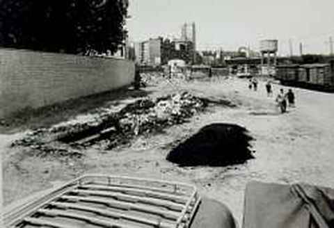El muro de la izquierda cerraba la fábrica de Tabacos, que entonces tenía árboles en su interior, mientras a la derecha se ven los vagones con mercancías para el puerto, con la lonja al fondo, tras el depósito de agua. Es el comienzo de las obras de la Avenida del Ejército.