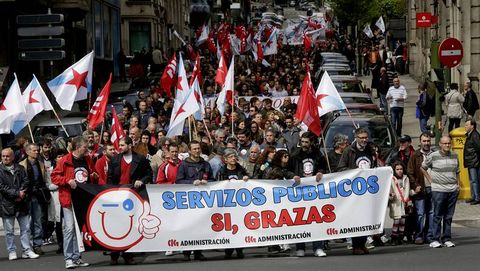 Aunque el lema principal de la faja que encabezaba la marcha era «Contra a explotación e a pobreza fagamos fronte a UE», los eslóganes y discursos cargaron contra el recorte de derechos que se ha producido con el PP al frente de distintas administraciones.