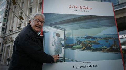 22 dic 2017 . Actualizado a las 05:00 h.Cuando tenía 15 años tuvo que afrontar la «molestísima» tarea de llevarle una carta a Urbano Lugrís en la que se conminaba al artista a que fuera acabando el mural que había empezado a pintar en las nuevas oficinas del Banco Hispano-Suizo, en la calle Real. Esto recordaba ayer, entre risas, Fernando Suárez, delante de una de las fotografías de la exposición Un año de Voz que recoge la rehabilitación de dicho mural, ahora denominado Vista da Coruña 1669. Cuando tuvo que hacer aquel encargo era el año 1952 y hacía poco que había entrado a trabajar como botones del banco. El motivo del aviso a Lugrís era que el andamio instalado en la sala de operaciones del banco con el fin de que el artista pudiera pintar molestaba a los clientes.