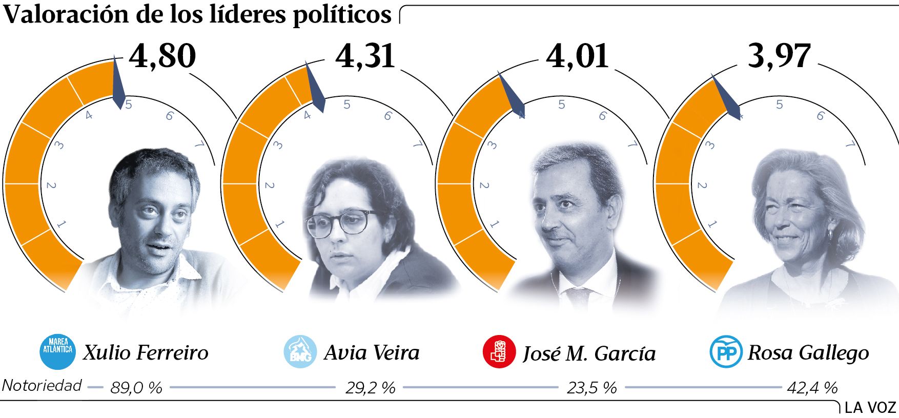 Ferreiro aventaja con holgura la clasificación de notoriedad. Lo conoce el 89 % de los encuestados. La siguiente es Rosa Gallego, a mucha distancia, con un 42,4 %. Todavía más lejos se sitúan Avia Veira (24,8 %) y José Manuel García (19,9 %).