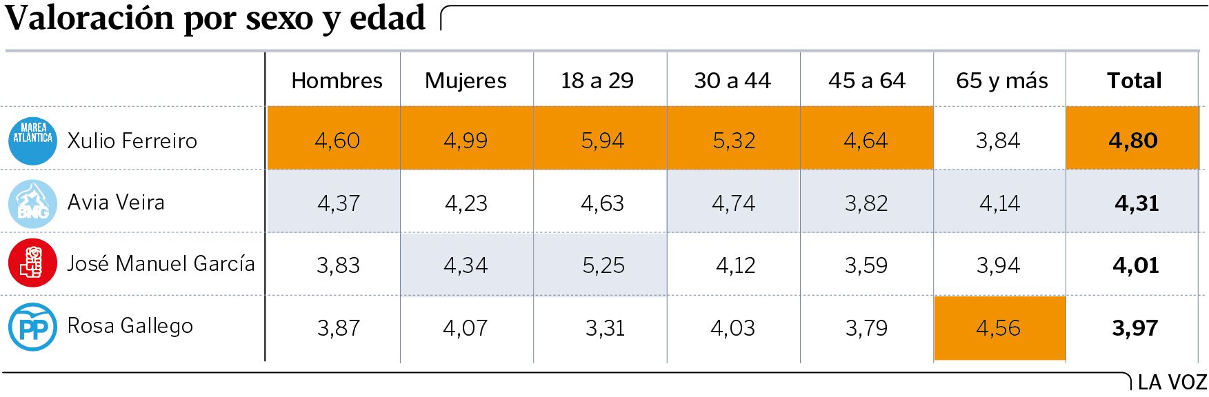 El político mejor valorado entre los jóvenes es Ferreiro, con un 5,94. Le sigue el portavoz socialista con un 5,21. La puntuación del alcalde va cayendo a medida que aumentan las franjas de edad. Pierde el aprobado entre los mayores de 45 años y cae por debajo del cuatro entre los que superan los 65. A la portavoz del PP le ocurre lo contrario. Recibe su mejor registro en esa franja de edad y el peor entre los menores de 29 años. Veira es la segunda política mejor puntuada en todas las franjas a partir de los 29 años, y es la única que obtiene una nota más baja entre las mujeres que entre los hombres.