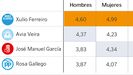Ferreiro es, con diferencia, el político mejor valorado por las féminas, que en conjunto lo sitúan al borde del aprobado con un 4,99 y una diferencia de más de seis décimas por encima del portavoz del PSOE, que se sitúa en segunda posición.