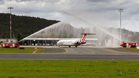 Alvedro dio la bienvenida a la nueva aerolínea con el tradicional arco de agua