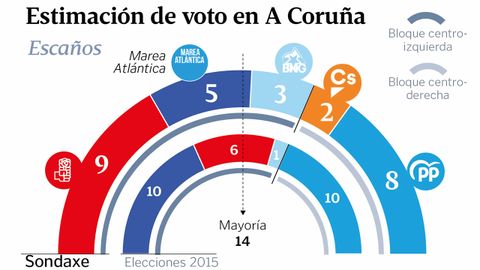 18 may 2019 . Actualizado a las 10:26 h.La campaña de las elecciones municipales del 26M cruza este viernes la línea del ecuador y el tracking diario elaborado por Sondaxe para La Voz apunta un movimiento pronunciado en A Coruña, donde hay hasta cuatro partidos peleando a los puntos por repartirse concejales. De momento, son el PP y el BNG los que se llevan el gato al agua a costa del PSOE y la Marea Atlántica, que ceden ambos representantes.