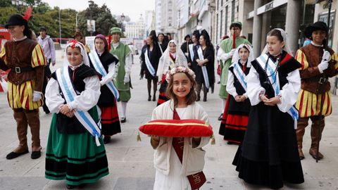 23 jun 2025 . Actualizado a las 12:45 h.En esta mañana de lunes también hubo celebraciones más institucionales y con solera, aunque no se ubiquen físicamente en las playas, como los actos que organiza la Comisión Promotora de las Hogueras de San Juan de La Coruña, que se fundó en 1970. Así, a las doce menos cuarto en punto, salió del Cantón Grande la comitiva de las Meigas 2025, encabezada por la Banda de Música de Cedeira y presidida por la Meiga Mayor, Antía Martínez, y la Meiga Mayor Infantil, Catalina Guerra. Con ellas estaban la guardia de honor, heraldos, corchetes y las otras damas vestidas de gala. «Deberían ser más, pero algunos nos llamaron que habían dormido en la playa y no podían estar en la comitiva», confesaba la presidenta, Conchita Astray, al punto que iniciaban el paso.
