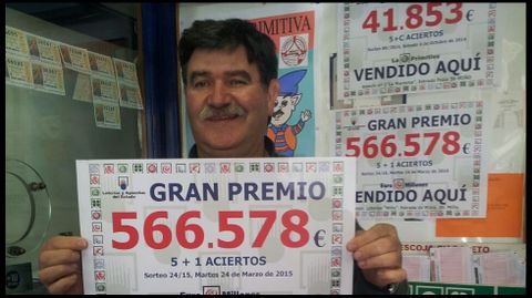 26 mar 2015 . Actualizado a las 05:00 h.El premio nadie se lo quita, pero tendrá que esperar para poder cobrarlo. En la administración de lotería La Marisma de Miño se selló un boleto del euromillones agraciado con 566.578,90 euros. El afortunado acertó cinco números más de uno de los dos complementarios. «Una pena, un numerito más y se lleva los 52 millones del bote», comenta Vicente Allende, que regenta el despacho desde hace 28 años. Lo que sucede es que el apostante selló un boleto de dos apuestas para los sorteos del martes y de mañana (8 euros) y «tiene que esperar a que sea el del viernes y lo podrá cobrar a partir del lunes, antes es imposible. Todavía puede aumentar el premio porque hay un bote de 64 millones», apunta el lotero, feliz por su racha de suerte. «Para ser una población pequeña como Miño ya di un segundo premio de la lotería nacional el año pasado, otro premio de la primitiva y hace 18 años recuerdo uno de la bonoloto de 286 millones de pesetas», recuerda. El afortunado solo tiene que aguardar cinco días para disponer de más de medio millón de euros. A pesar de la espera, cualquiera nos cambiaríamos por él. Como si nos dicen que hasta mayo no nos dan la pasta. «A ver sin nos manda una cajita de vino de reserva y brindamos todos juntos», asegura Vicente, casi tan ilusionado como el poseedor del millonario boleto.