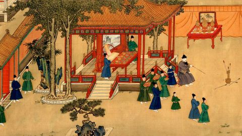 Una muestra del poder y la influencia de la figura del emperador se puede apreciar en un pergamino del periodo 1426-35 en el que se observa a un gobernante Ming sentado en el palacio en una gran silla rodeado por sus más cercanos colaboradores.