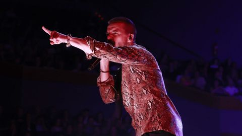 Alguno habría en las butacas, pero mayoritariamente se desprendía adoración y acompañamiento emotivo por ese repertorio que fue avanzando por Este es el momento, El extraterrestre y La carta, con su madre Amparo Valle en las pantallas. A mitad de función llegó, claro, el momento karaoke de No puedo vivir sin ti, que dio paso a un giro de guion: la retirada de los músicos y el artista en solitario. Pretendía recrear aquellos momentos complicados del inicio de su carrera en solitario, tocando «en garitos para 60 personas como mucho». De ahí salió, recordó, la inspiración para su mejor canción, Berlín. La interpretó en acústico, desplegando la hipnótica belleza de una pieza que gira en círculos que siempre llevan al «para toda la vida». La acompañó con Hasta el final y, sacando un nuevo conejo de la chistera, durante El último hombre apareció primero el teclista y, poco después, la banda al completo, para culminar a lo grande en otra exaltación armoniosa de música, fantasía y brillo.