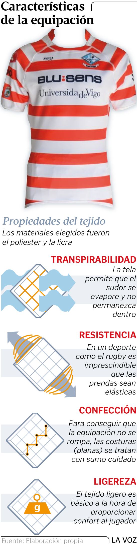 11 abr 2016 . Actualizado a las 05:00 h.Cuando arranca un partido de rugbi lo único importante es el oval. Los jugadores no pueden permitirse el lujo de preocuparse de que los tirones, los agarrones o los viajes al suelo le pasen factura a su vestimenta, por eso cuando el Universidade Vigo Rugby decidió recurrir al made in Galicia para sus equipaciones, lo hizo teniendo en cuenta que solo darían el visto bueno a lo mejor. Querían diseño, pero, sobre todo, prendas irrompibles. Y eso fue lo que encontraron al lado de casa. Contactaron con la firma viguesa Amura, a la que trasladaron el reto de confeccionar camisetas a prueba de rugbiers de División de Honor, categoría en la que entonces militaban.