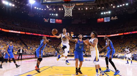 19 may 2016 . Actualizado a las 10:58 h.La inspiración en el juego individual llegó de nuevo de la mano del base Stephen Curry, que superó una caída entre los espectadores y se convirtió en la gran figura que permitió a los Warriors de Golden State vencer por 118-91 a los Thunder de Oklahoma City en el segundo partido de la serie de finales de la Conferencia Oeste de la NBA. Curry, que aportó 28 puntos, incluidos 17 tantos en menos de cinco minutos, cumplió con su promesa que los Warriors demostrarían en el segundo partido la clase de equipo campeón que defiende el título de liga. «Dije que no esperaba la hora de volver al campo después de haber perdido el primer partido y que íbamos a demostrar el carácter y la clase que hay dentro del equipo», declaró Curry al concluir el segundo partido, que les permitió empatar a 1-1 la serie que disputan al mejor de siete. «Mi caída entre el público no tuvo mayor importancia, mi mente estaba puesta solo en hacer todo lo necesario para ganar el partido».