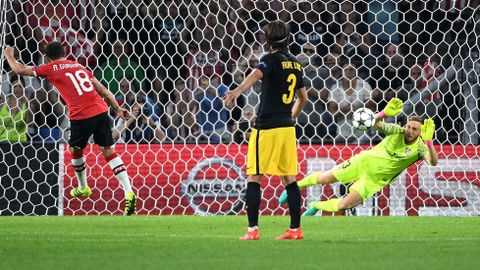 Los contendientes se empleaban con ambición, pero estaban tan bien trabajados que costaba sangre y sudor generar ocasiones. Se adelantó el Atlético cerca del descanso, fruto de la insistencia en el disparo de Saúl, primero con la derecha y luego con la zurda. Protestaron los del PSV porque apareció sangrando Propper, quien recibió un frentazo de Giménez en una acción involuntaria justo antes el gol. Tanto grito del respetable encontró su objetivo en el descuento. De nuevo se internó Narsingh, perseguido por el central charrúa, que no llegó al balón, pero tampoco pareció impactar con el rival. Pero señalaron penalti y Oblak demostró que no es una estatua en esta suerte. Se le criticó con dureza tras la final de Milán ante el Madrid, pero esta vez le hizo una gran parada al mexicano Guardado.