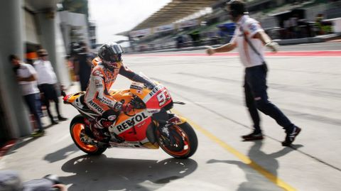 29 oct 2016 . Actualizado a las 05:00 h.Marc Márquez fue el más rápido en el arranque del Gran Premio de Malasia 2016. El más rápido por la mañana, en los primeros entrenamientos libres, la sesión que dejó la clasificación final de una jornada marcada por la irrupción de la lluvia justo en el inicio del primer libre de Moto2. Esto, unido a una tormenta nocturna y a los cambios en el asfalto del circuito de Sepang marcaron una jornada intrascendente desde el punto de vista deportivo. Márquez fue el más rápido sin poder salir a pista en el segundo entrenamiento del día por las consecuencias de una gastroenteritis que se llevó a Malasia tras un evento promocional de Honda en Yakarta (Indonesia), a donde viajó después de la carrera de Australia. Desde el miércoles, el piloto de Cervera se había sentido indispuesto después de haber comido un plato local. Fue arrastrando el malestar hasta el viernes y que terminó provocándole una deshidratación que le dejó en fuera de juego en la tarde de la primera jornada. «Por la mañana ya no me encontraba muy bien, pero he podido salir a pista aunque no estaba al cien por cien», explicó el piloto.