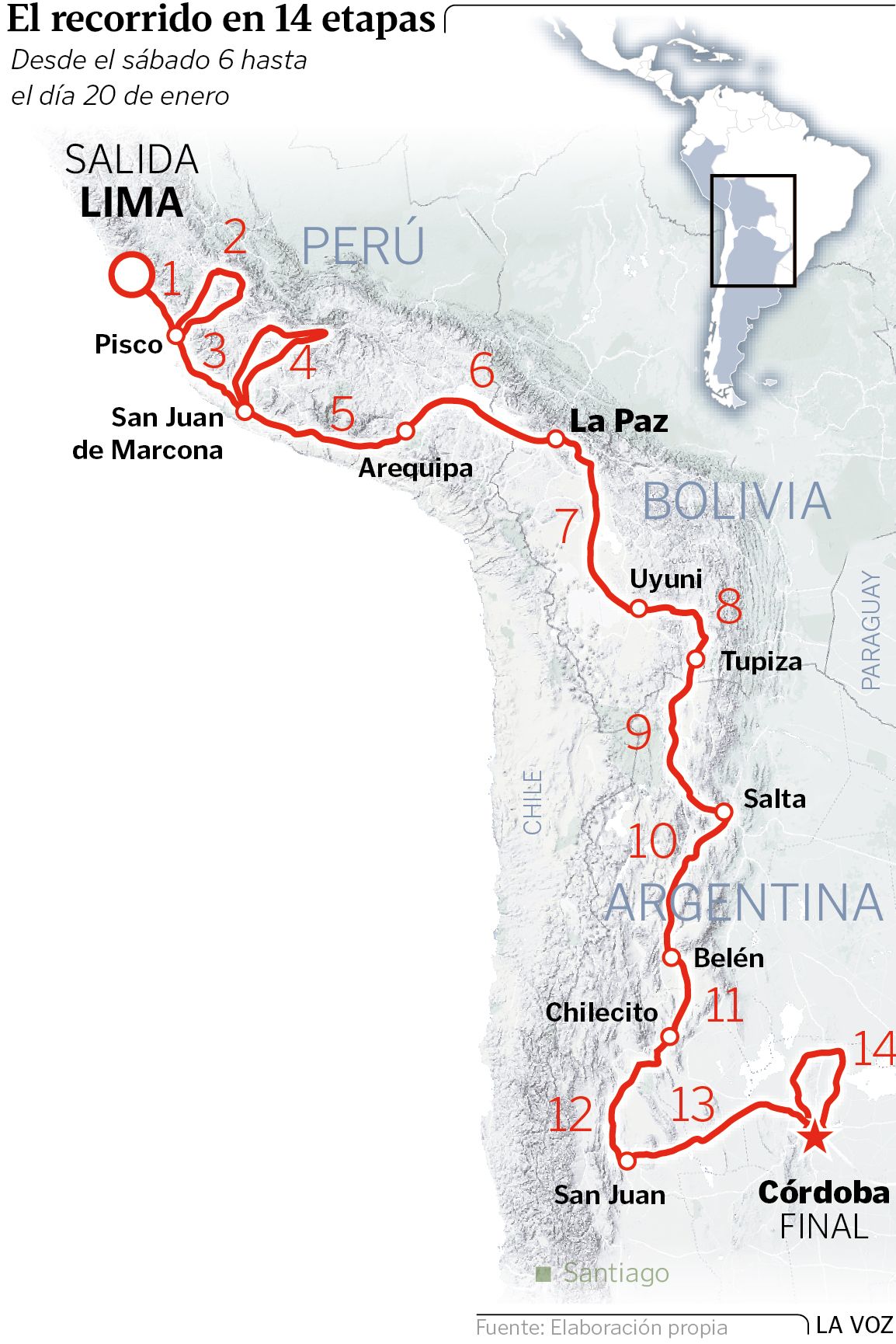 21 dic 2017 . Actualizado a las 07:47 h.El día de Reyes comenzarán las sorpresas. De Lima a Pisco, gran combinación, para abrir boca. A partir de ahí, nueve mil kilómetros en catorce etapas (siete de ellas por un trazado completamente dunar y fuera de pista) con cinco días por encima de los tres mil metros de altitud. Hasta llegar a la Córdoba argentina. Infierno de calor y hielo. Con dos gallegos.