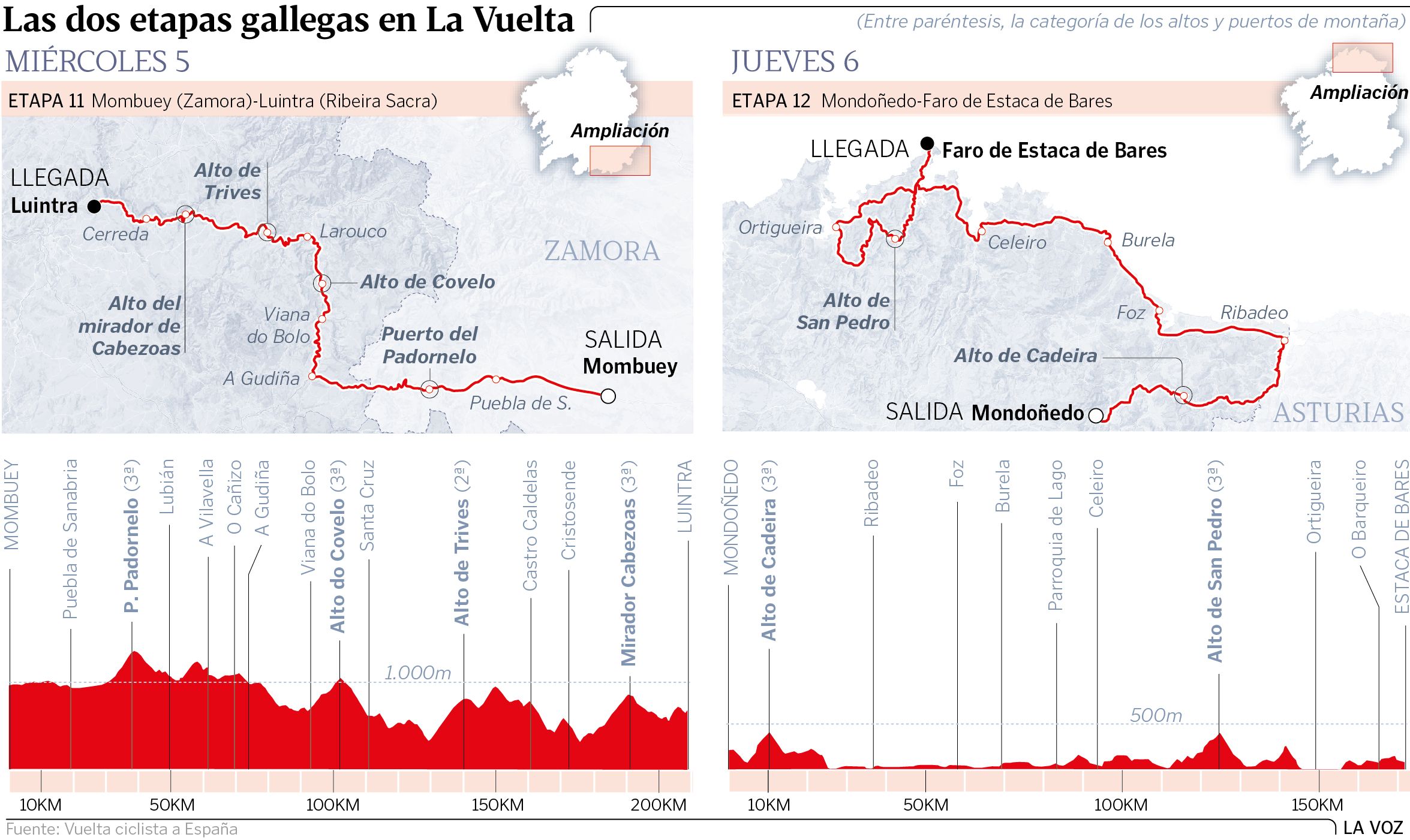 La característica más notoria de las dos etapas gallegas de La Vuelta 2018 es la irregularidad de su perfil orográfico, si bien tampoco se puede obviar que el desarrollo de la carrera marcará el verdadero desgaste del pelotón. Así lo afirma Delio Fernández, el deportista del Delko KTM: «Si hay alguna fuga subiendo, que es lo más probable, hablamos de hombres de calidad, pero en este tipo de etapas son los primeros kilómetros los que marcan el resto de la carrera. En Ourense, ya me comentaron hace dos años que el pelotón se quedó muy sorprendido. Desde A Rúa suben a Trives y Castro Caldelas, para enfilar después el Canón do Sil y, al final, aún les queda un repecho-puerto cerca de Luíntra. Al día siguiente, para llegar a Estaca de Bares, transitarán por vías costeras en el norte de Lugo y también es una zona muy complicada».