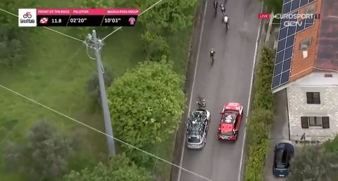 13 may 2021 . Actualizado a las 18:10 h.Tremendo susto en la sexta etapa del Giro de Italia. En una carrera que está teniendo un inicio accidentado y en la que este miércoles ya tuvo que abandonar Mikel Landa por una caída, hoy un nuevo incidente puso a los espectadores los pelos de punto. El coche del BikeExchange atropelló al corredor del Deceuninck-Quickstep Pieter Serry. Se trata de una escena extrañísima que capturó la señal en directo a través de la cámara del helicóptero. El coche del BikeExchange trataba de ponerse en paralelo con el vehículo del juez de carrera. Cuando trataba de alcanzarlo, el conductor no vio al corredor belga que se quedaba descolgado y se lo llevó por delante.
