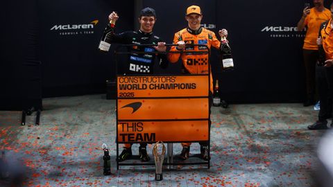 Pero si ese roce no es más que un incidente de la carrera y entra dentro de las costuras de la libertad de los pilotos para pelear entre sí —algo que suele salir bastante mal, y más en McLaren—, lo visto después de la carrera deja bien claro que el ambiente en Woking es de todo menos cómodo. Las redes se han encargado de hacer viral el detalle: mientras Carlos Sainz habla ante los medios, por detrás aparece un Oscar Piastri con su habitual rostro inexpresivo propio de un Playmobil mirando la pantalla que está detrás. La escena en esa televisión era la de su propio equipo con botellas de champán en mano subidos al podio celebrando el título de constructores. Él, líder del campeonato de pilotos y responsable de haber aportado más de la mitad de los 650 puntos con los que McLaren ha confirmado el trofeo —336 puntos, un 51,46% exactamente—, vio por una televisión cómo el resto del equipo festejaba. Es, a todas vistas, una imagen anormal cuando menos.