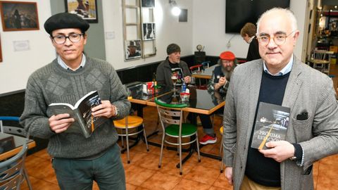 El escritor Cándido Duro Domínguez presentó ayer su primera novela en el Café de Mili de Lalín. El autor, que estuvo acompañado del pintor Carlos Santos, dio a conocer detalles de Próxima estación, en el que narra vivencias y escuchas de un funcionario que viaja en tren a diario entre Pontecesures y Vigo. foto Miguel Souto