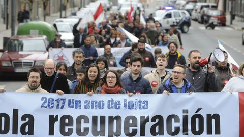 02 may 2017 . Actualizado a las 05:00 h.En torno a un centenar de personas recorrieron ayer las calles de A Estrada en una reivindicación del 1 de mayo organizada por CIG. Encabezada la marcha una pancarta en la que se leía «2017 un ano de loita. Pola recuperación dos dereitos», mientras los participantes coreaban «Non pode ser, obreiros nas cadeas e corruptos no poder», y frases como «Queremos traballar e non emigrar» o «O público é servizo, o privado beneficio». Junto a Merayo participaron ediles como Mar Blanco, Xosé Magariños y Paco Vilariño.