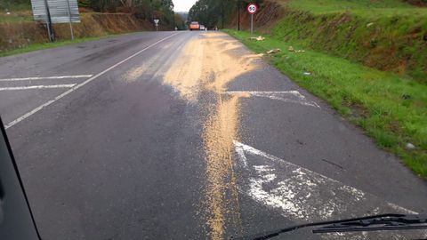 Efectivos de Emerxencias de Lalín llevaron a cabo en la mañana de ayer la limpieza de la calzada tras la caída de pienso detectado en distintos puntos en la rotonda de la carretera de Brántega, por encima del hipermercado Carrefour. Hasta el lugar se desplazaron también agentes de la Policía Local.