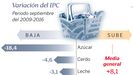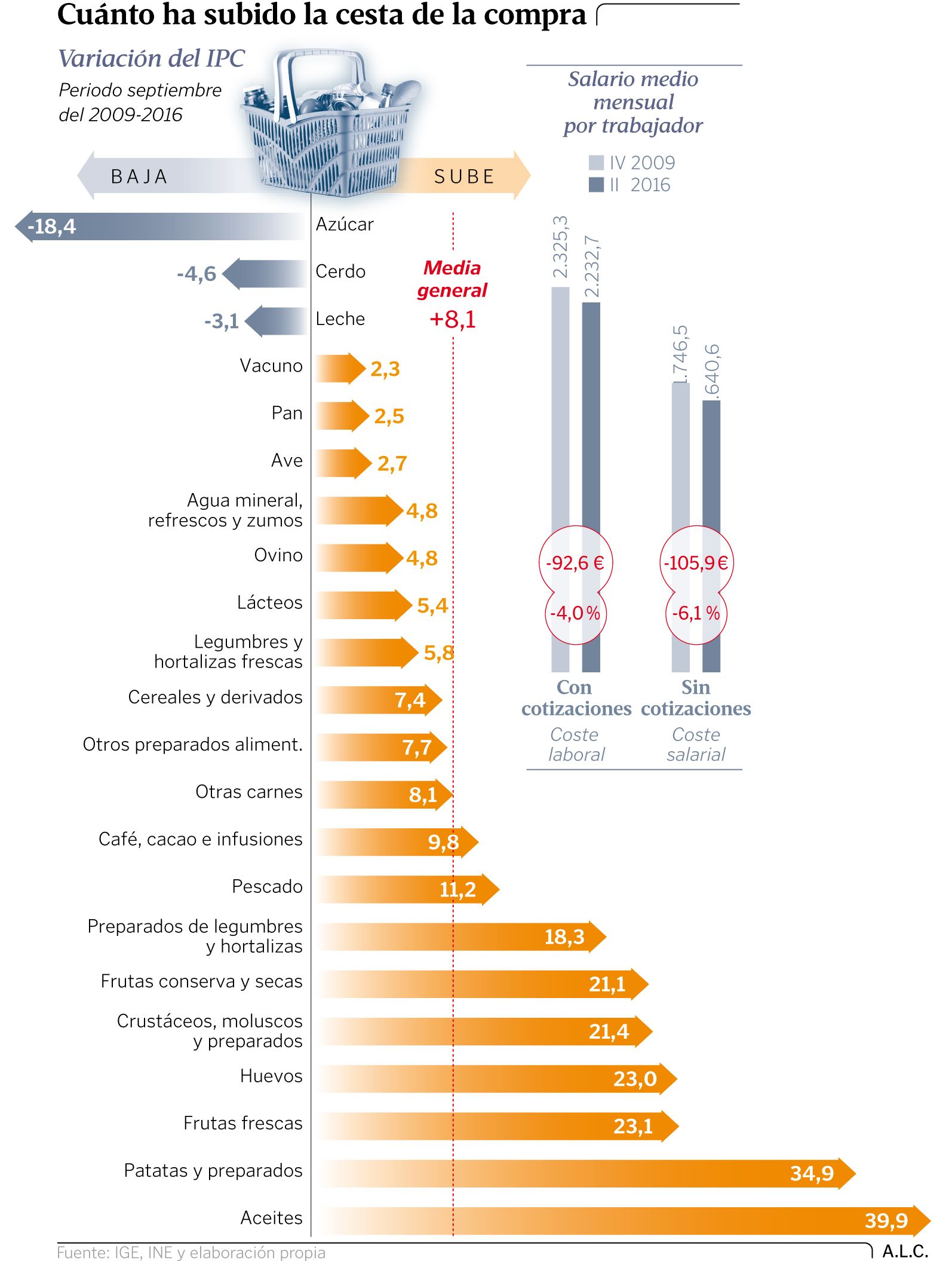 13 nov 2016 . Actualizado a las 05:00 h.Pese a que el IPC no abandonó las tasas negativas el año pasado y a que su última actualización, correspondiente al mes de septiembre -el INE publicará el martes los datos de octubre-, arrojaba en Galicia una tímida subida de dos décimas, llenar la cesta de la compra con los productos básicos de alimentación se ha encarecido durante la crisis. Y lo ha hecho del orden del 10 % entre el 2009 y la actualidad, por encima de la media general del índice en el período (el 8,1 %), y precisamente en una etapa en el que los sueldos registraron la evolución contraria, al acumular un descenso del 6 %, según los últimos datos de la encuesta trimestral de coste laboral, correspondiente al segundo trimestre del año.